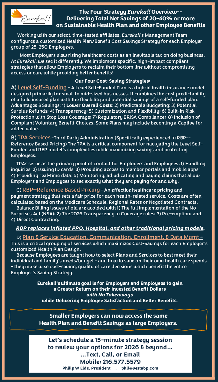 Eureka!! Is an "Aggregator and Coordinator" of Companies and Professionals providing Health Plan and Employee Benefits related plans, programs and services that deliver proven, time-tested capacities that reduce the cost of Employer's Health Plan and other Employee Benefits by 20% to 40% or more?